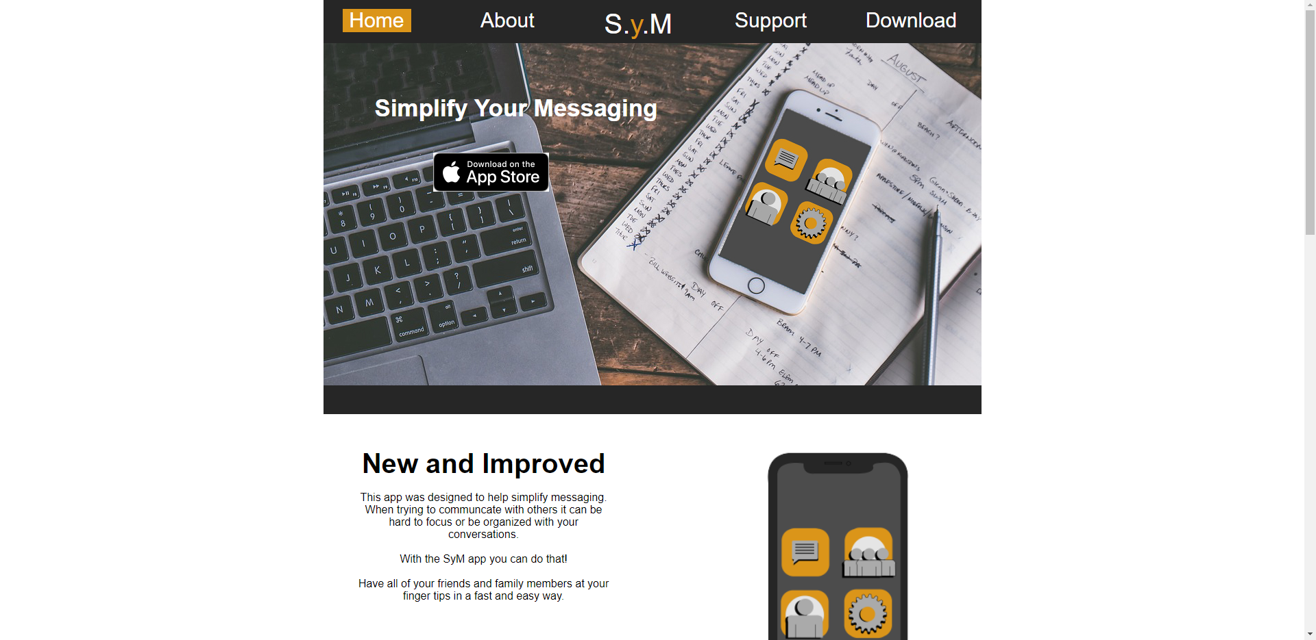 This Mini-site was developed for my app that I mocked up called "S.y.M". This app was made to make messaging and staying connected with your friends, and family more simple and fast. My role as the creative director was to create an app that was more appealing and was more simple and not clunky. I had asked a few people to give examples of what apps they use and what they liked and disliked about each app. Then I started to mock up and lay out some ideas and concepts. After working and getting some prototypes and making changes to improve upon the design, I was finished with the app and made a mini-site to help promote the app.